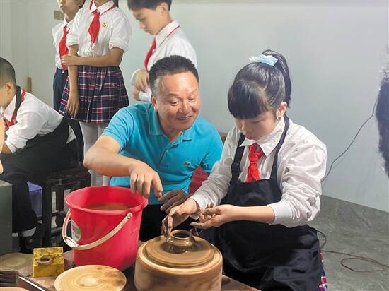 在培训班现场,正高级工艺美术师、中国工美艺术大师、非物质文化遗产传承人张瑞端携手工艺美术师张泽锋等6名指导老师,对18名来自瓷都实验小学的学生进行“手把手”教学,悉心传授手拉朱泥壶制作技艺。