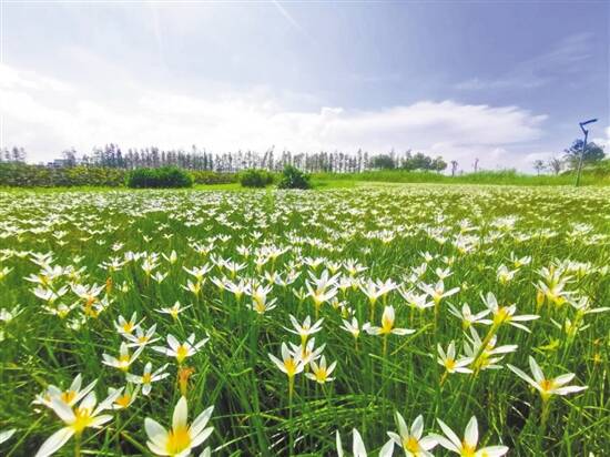 葱兰又名葱莲、玉帘,是石蒜科葱莲属的多年生草本植物,花期长,容易生长,高度为20-30厘米,多种植于城市花坛边和路边小径。在华发水郡省级湿地公园的绿化带,遍地开满了葱兰。叶片犹如小葱般呈细圆空心状,一朵朵洁白的小花,由纤瘦的绿叶中冒出来,亭亭玉立于风中,远远望去,洁白似雪。