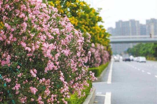 夹竹桃因其叶似竹、其花似桃而得名,花冠深红色或粉红色,花期几乎全年,夏秋为最盛,属常绿直立大灌木。夹竹桃适应性非常强,养护较为简单,而且还有净化空气的作用,是常见的城市绿化植物。初冬时节,斗门湖心路、白蕉大道等路段约16000棵夹竹桃迎来盛开季,绿叶映衬下的花朵白、红相间,十分美观。