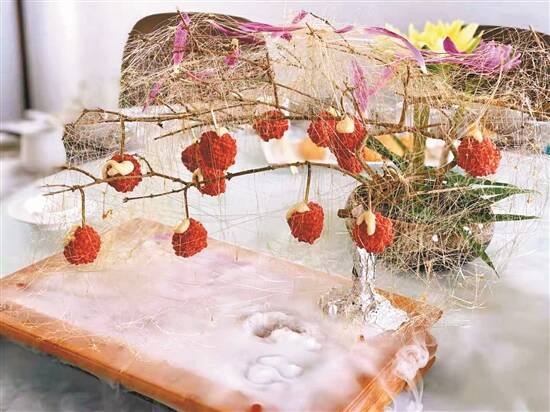艺术和美食竟然如此融洽!初见“停云小镇”的大厨,就觉得他身上有浓浓的艺术气息。果然,他的出品也是将艺术与美食完美如何在一起。“红颜妃子笑”给我留下了深刻的印象。就地取材的树枝化成荔枝树,将食材做成一颗颗荔枝模样挂在其中,食糖加热拉丝后巧妙装扮。当我们品尝时,气化的干冰从盆地涌出,宛若仙境,真是美不胜收。