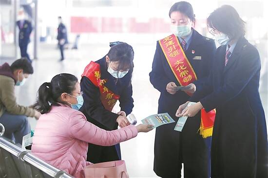 东莞东站工作人员给旅客派发防疫指南