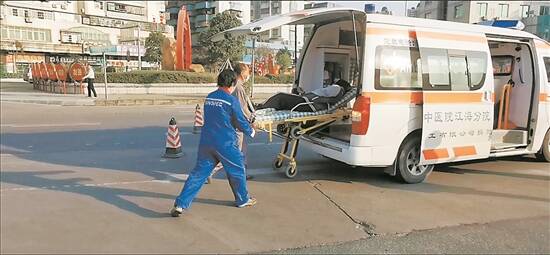 陈雁影协助医护人员将伤者推上救护车