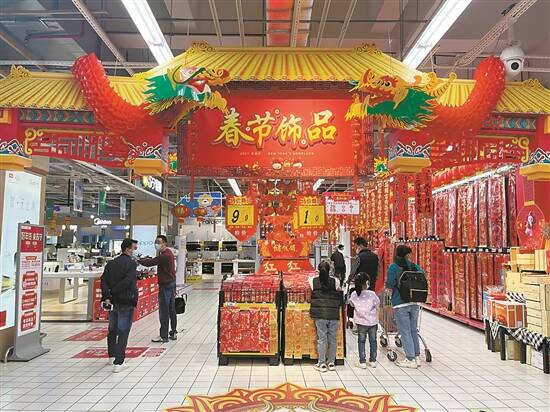 近日,笔者来到位于珠海斗门大信新都汇的大润发超市。一进门口,笔者就感到了浓浓的年味,商家在入口处设置了“年货大街”红红火火节庆装饰,从超市的店头到店尾,都营造起浓厚的过年氛围。迎新春,贴福好运来,春联挂起来。年货大街里有传统的挂历春联区,大大小小的牛年生肖玩偶、造型新奇的节日挂件区,有糖果、饼干等年货区,还有油盐酱醋等日常必需品区,每个货架上的商品都满满当当。
