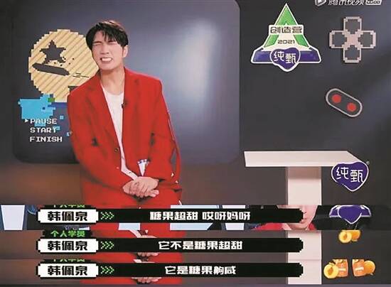 目前,韩佩泉还未在《创造营2021》中登场表演,但自从节目开播,他就频频登上微博热搜榜,其耿直的“现场解说”让网友对他好感倍增:第一组选手自我介绍时,他直言“他不是糖果超甜,他是糖果齁咸”;面对外表帅气的甘望星,他忍不住夸奖“哎呀,妈呀,太漂亮了”,但看到甘望星的表演后,他又吐槽“听完第一句,差点过去”。不少网友表示:“请把韩美娟的嘴留到决赛。”