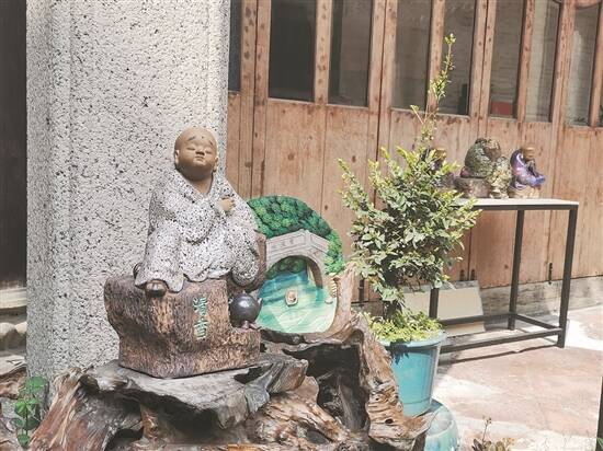 祠堂内布置更是移步换景。进入大门,一眼便可望见栩栩如生的“福禄寿”三个石湾公仔笑脸相迎。在祠堂天井处,数十盆盆栽中间,亭台假山点缀其间,憨态可掬的陶塑或在其中“酣睡”,或沏上一壶茶,怡然自得。