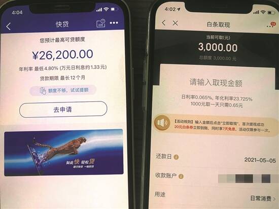 “没想到网上贷款利率居然这么高!”读者小凯告诉笔者,之前在京东购物付款的时候,看到开通京东白条还能减免几块钱,就顺手开通了。点进去京东白条,看到1000元借一天才几毛钱,没什么概念。前段时间买家具的时候就借了几万元。