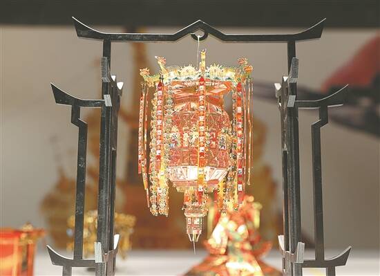 千角灯手链的开发并没有花很长时间,因为千角灯于杨琦兰而言已经是一位熟悉的“老朋友”。记者注意到,千角灯手链上串有“灯顶”“灯体”等千角灯主要结构部分,最特别的是代表“二十四孝图”灯带的24条穗子。千角灯手链首批量产200条,杨琦兰并没有把它推向市场,而是作为好合苑文创集团贵宾礼品,“就是想告诉大家,非遗可以用这样的方法去传承。”