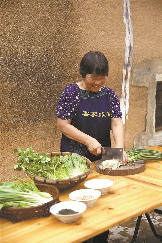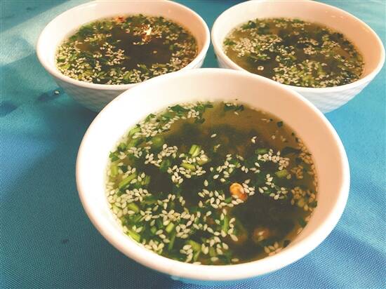 据她介绍,这道客家咸茶的风味美食制作用料并不复杂,只要先把水煮到有少量气泡沸腾再改为温火,按适量比例放入绿茶;炒好芝麻、花生,切好芫荽或生菜混上少许油盐,用刚刚好的茶水调制,一道咸茶便可制成。