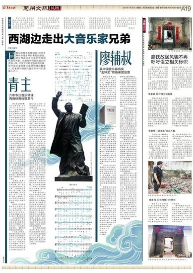 同胞兄弟青主和廖辅叔,出生于惠州府城金带街著名的廖屋,是从西湖边走出来的中国现代音乐大家。前者是中国现代音乐的先驱人物、中国艺术歌曲创作的先锋,现代音乐美学理论最早的理论奠基人;后者是中国现代音乐学学科的奠基人之一。