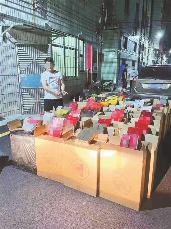 7月30日0时许,正在蹲守的民警们紧盯嫌疑人住处。这时,只见史某京一个人鬼鬼祟祟地下楼了,往停车场方向走去。此刻正是抓捕时机!民警一声令下后,抓捕小组的成员从四面八方冲过来,将嫌疑人史某京层层围住。经现场核查,嫌疑人车辆后座的座椅已被全部拆除,摆放了16箱假冒烟草。后抓捕警力趁热打铁,分别在上星社区莲塘西区某出租屋和深巷路16号某铺面查获存放假烟仓库2个,缴获假烟3500余条,总涉案价值约50万元。