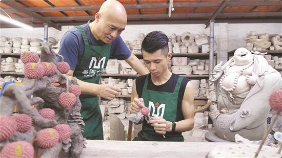 有意思的是,这些年陆续有年轻陶艺师,通过淘宝店联系上庞家父子,并不远千里来到石湾镇学习这门手艺。这其中有来自贵州、重庆以及四川的,最年轻的陶艺师是一名90后。年轻血液的注入,让石湾公仔摆脱“土气”“老派”的标签,增加了现代性和萌趣感。例如贵州80后陶艺师罗廷勇,制作出可爱的Q版门神摆件,吸引诸多年轻客户下单。89年的陶艺师李左,擅长创作荔枝等植物类陶艺品,恰好踩中当下年轻人爱养植物的潮流。