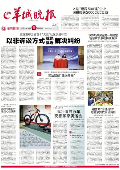 羊城晚报讯 记者沈婷婷,通讯员吕静、连天、黄珍珍摄影报道:8月4日下午,深圳市宝安区人民法院举办“深圳市诉源治理非诉解纷试点单位(无讼社区)” 授牌仪式暨《石岩街道“无讼”社区创建标准体系规范(试行)》(以下简称《规范》)发布会。据悉,“无讼”社区创建标准在广东省范围内尚属首次发布,涵盖总体原则、平台建设、机制保障、评估指标等具体细则,首次对“无讼”社区的概念进行了明确,并对“无讼”社区创建评估指标进行了设定,为“无讼”社区创建工作明确了方向、规范了举措、提供了样本。