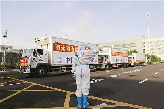 羊城晚报讯 记者钱瑜,通讯员谭畅、洪烨琳摄影报道:8月12日7时许,三辆满载新冠疫苗的运输车经港珠澳大桥口岸顺利出境,珠海边检总站港珠澳大桥边检站启动绿色通道,仅用时10分钟就完成了三辆货车的出境查验,继快速验放300名援澳医护人员后,在港珠澳大桥这座“同心桥”上再次书写了珠澳同心抗疫的佳话。