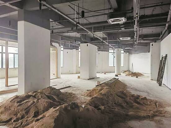 记者实地采访时走侧门进入施工现场,看到施工楼道间内堆满工人的生活垃圾,散发出难闻的气味。二层施工现场堆满了砂石木料,无人看管;原本的墙面已被部分拆除,改造出一片200平方米左右相对空旷的空间;天花板上横截面直径约半米的方形铁皮管道纵横交错,部分排风系统和空调系统已经安装完毕。据业主魏先生反映:“在住建部门叫停的时候,现场有些地板和管道并未安装到位,该处似有叫停后继续施工的迹象。”