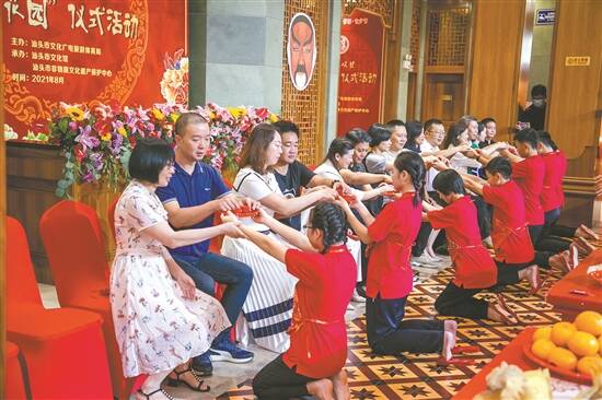 除了针对海内外潮青的“云上出花园”外,许多创新元素也逐渐与传统习俗相融合。据陈少冰介绍,在已成功举办的两届集体“出花园”仪式活动中,他们陆续加入了朗诵“社会主义核心价值观”、向父母敬工夫茶等环节,让传统习俗与时俱进,也有助于成年孩子塑造正确的人生观、价值观,增强他们的责任感和家国意识。
