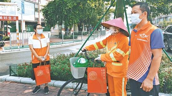 从站台停靠的公交车司机,到路口站岗的辅警,再到不同路段清扫落叶、垃圾的环卫工人,各行业一线员工对这份中秋祝福感到暖心。“每天早上五点上班,到上午十点半下班,下午有时候会加午班,一年几乎不怎么放假,非常感谢你们送来月饼。” 接过装着月饼的袋子,祖庙街道环卫工人刘阿姨向春蕾互助服务队感谢道。
