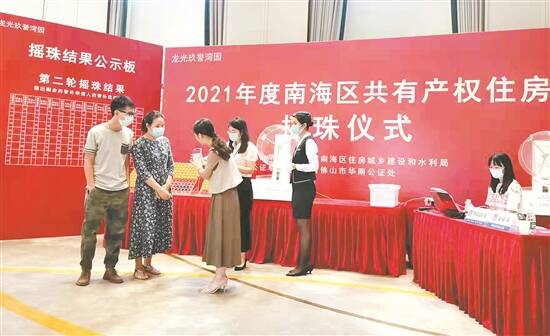 据悉,整个摇号过程,公证人员现场监督现场工作人员严格按照《2021年佛山市南海区狮山镇龙光玖誉湾园共有产权住房项目抽签(摇珠)选房活动工作方案》的规定进行操作,并对摇号结果进行确认,迅速对外公布。