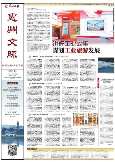 惠州市“十四五”规划提出,大力实施“文旅+”战略,促进文旅业态融合创新,不断满足文化消费升级需求。工业旅游作为文旅业态融合创新的形式,日益受到关注。今年9月,广东省文化和旅游厅与广东省工业和信息化厅联合公布了2021年广东省工业旅游培育资源库入库名单,惠州共有7家企业入选。