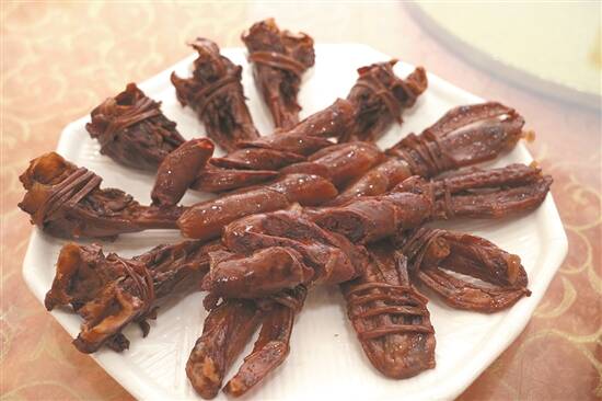 横山大酒楼的鸭脚鸭翅选自莲洲本地饲养60天以上的麻鸭,鸭下巴、鸭脚、鸭翼、鸭肝、鸭肠和腊肉采用“香姨”特调秘制酱汁,用传统的方法腌制,而且拒绝用机器烘干,百分之百太阳底下晾晒,这样制作出来的鸭扎包,外观呈琥珀色,晶莹剔透,光泽鲜亮。