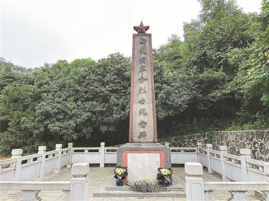 白花社区的前身是一个拥有300年历史的客家村落。同时,这也是一个具有光荣革命传统的村落。沿着柏油小路进去,映入眼帘的是风格独特的碉楼。再行走一公里左右,这座六米高的纪念碑就矗立在松柏之间,凝重庄严。