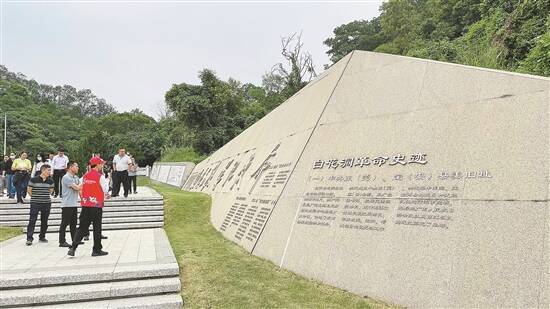 行走在白花洞革命烈士纪念园内,历史的厚重感迎面扑来。园内一座6米高的纪念碑如利剑般直插云霄,俯瞰着鹏城大地,凝重庄严。环顾四周,两侧葱郁的松柏树苍劲挺拔,与湛蓝的天空、灰白的石阶相得益彰。纪念广场、纪念柱和烈士浮雕墙修葺一新,无时无刻不让人感受到先烈们用鲜血和生命谱写的英雄壮歌氛围,这就是位于深圳光明的白花洞革命烈士纪念碑。