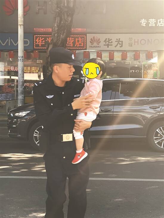 坐在副驾驶位的辅警黄仕彪迅速下车,跑过去将小女孩紧紧抱着,走到安全位置。许是受到了惊吓,小女孩啼哭不止,黄仕彪抱着小女孩轻声安慰。由于小女孩年纪尚小,无法说出家人的相关信息,黄仕彪只能抱着小女孩一边安抚其情绪,一边和民警郑伟海到附近商场寻找其家人。