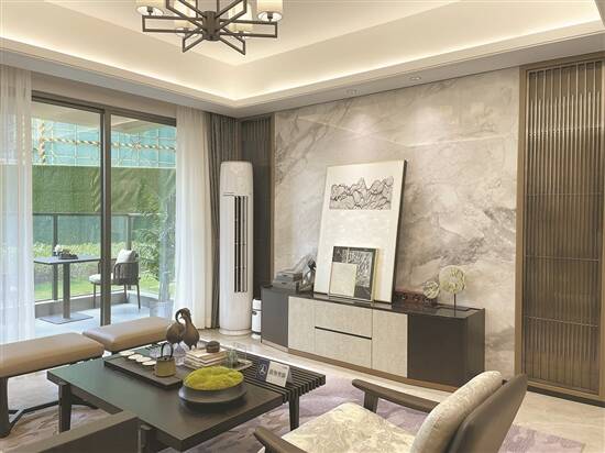 进入营销中心发现,其整体风格为新中式风格,简洁中带有艺术奢华与建筑美感。门庭建有三进式归家庭院,移步换景,寓意祥瑞的铜鹤与流水、迎客松相得益彰,犹如桂殿兰宫。乐声在空中回荡,古韵悠悠。