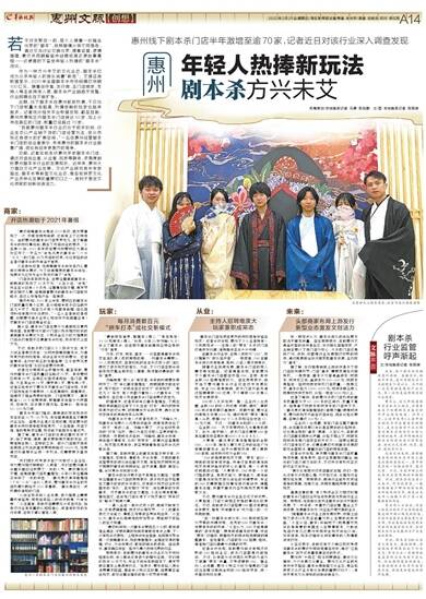 日前,记者实地走访惠州多家剧本杀门店,通过对话创业者、从业者、玩家等群体,多角度剖析惠州剧本杀行业的发展现状。近年来,惠州大力推动文化产业发展。文化产业研究有关专家指出,剧本杀等新型文化业态,是各地探索文化产业多样化发展的重要切口之一,有利于激发文化领域的创新创造活力。