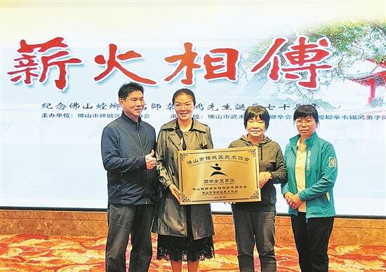 禅城区武术协会向韦锡鸿弟子同学会赠送牌匾,由韦锡鸿遗孀陈凤枝女士(右二)代接收