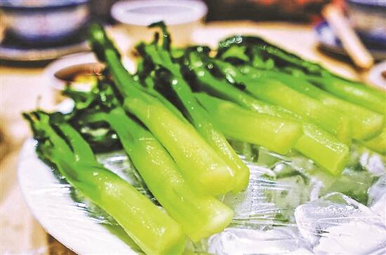 广府菜做芥蓝,用的是“飞水”加蚝油的“软炒”,先将菜放入油盐水中焯熟,捞出滤水,排列盘中,再淋上蚝油上桌。另一种冰镇芥蓝,灵感源自日本人用山葵加酱油搭配海鲜刺身。芥蓝与芥末的和谐,是因为同属“十字花科”的它们有共同的化合物,不会阻挡彼此的味道。