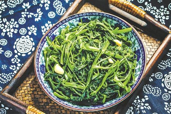 广府人还尤其爱吃通菜。通菜就是空心菜,颜色碧绿、茎秆中空,食之有滑叽叽的黏液感。虽然清炒最清清爽爽,适用于所有青菜,但一直清炒未免也太寂寞了,广东人脑洞大开,拿腐乳来炒空心菜。咸香鲜美的腐乳汁会挂在空心菜的菜叶和菜梗里,刚好给本来平淡无奇的青菜增添一些风味。