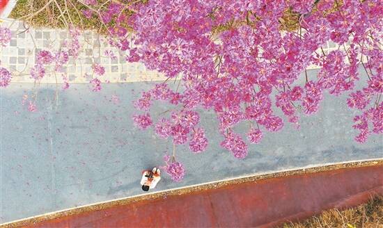 除了黄花、紫花风铃木,成千上万棵宫粉紫荆,也纷纷绚丽绽放,如云似霞,缤纷浪漫。