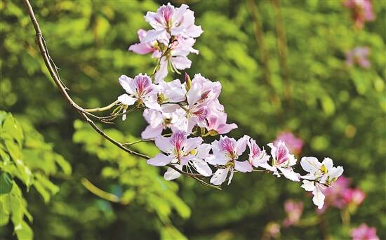 而在虹桥西路、珠峰大道等路段,满树繁花的宫粉紫荆,浅粉色为主、纯白色点缀,成为道路两旁的亮丽风景线。