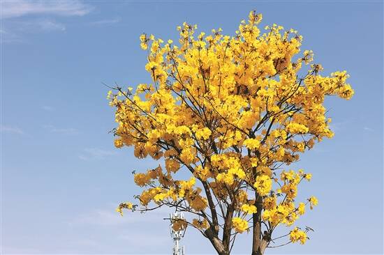 城区也随处可见那一抹金黄,在白蕉镇虹桥社区周边道路,黄花风铃木灿烂盛放,与林立的高楼构成了唯美的春景图。