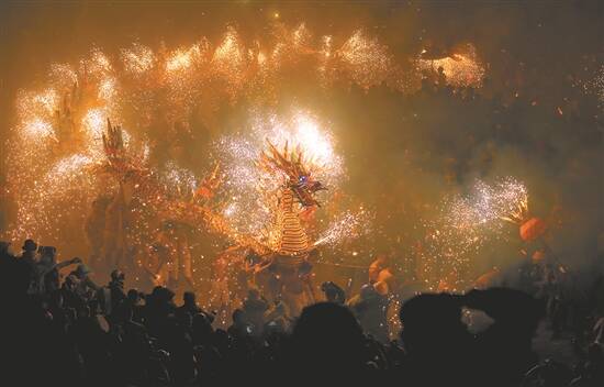 每逢新岁元宵到来,埔寨人民男女老幼,都渴望能看到火龙表演,为人们带来吉祥。擎“火龙”的村民光着肩膀,任由火花洒在他们的身上。火花溅到皮肤上起疱,寓意着钱财和好运。参观的人们也不太害怕被爆竹所伤,原来如果给龙身火花烫伤出了水泡,这个“泡”字,发音和钞票的“票”字差不多,那你来年一定会发大财。特别是擎龙头的就更了不起,人们都争着出钱,出钱最多的才能擎龙头,擎了龙头,在新的一年,一定会行好运,人们叫“大发龙运”(发大财)。