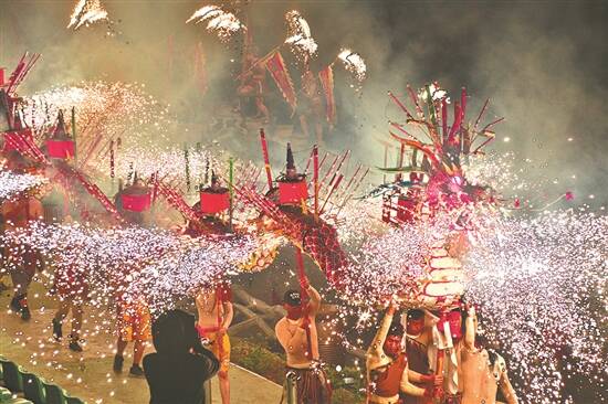 在乡村振兴产业政策指引下,丰顺县汤坑镇大宝山生态旅游养生度假区将国家级非遗项目进行了展演。《千年火龙》融合粤东丰顺的火龙文化、客潮文化、农耕文化和梅州现代典型文化元素、民俗事物及生活细节,结合光、电、影勾画出一幅活色生香的千年客潮原生态生活图。更重要的是,通过政府引导、民企主导、文化植入的多方合作模式,丰顺县探索出了民俗文化和乡村振兴相互促进的发展模式。