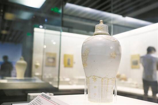 走进东莞市博物馆三楼展厅,一对白釉贴花折枝花纹兽钮盖梅瓶(以下简称梅瓶)是必看的藏品之一,也是该馆的“镇馆之宝”、国家一级文物。它是同类陶瓷艺术品中难得一见的珍品,保存完整、工艺精美,具有重要的研究价值和艺术价值,是名副其实的国宝。虽然历经沧桑,但优美的造型、莹润的釉色,尽显其艺术风韵。如今摆放在博物馆的展柜里,依然熠熠生辉。“之所以能成为‘镇馆之宝’,主要在于工艺精巧,市面稀见,具有极高的文化价值。这对梅瓶造型美观、釉色恬静,工艺为白釉贴花的装饰工艺,繁复且极为少见,堪称孤品;此外,这对梅瓶于2003年从位于东莞市寮步镇上屯村的东莞名家墓葬(钟松雪家族墓)出土,有明确的出土时间和使用者的相关信息。”杨晓东表示,原景德镇陶瓷考古研究所所长江建新曾到东莞市博物馆观摩此对梅瓶,确认其为景德镇窑作品,但至今窑址尚未发现此类瓷片,“可能是因为烧制工艺复杂,当时的此类作品非常少。”