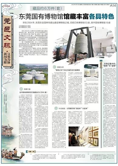 东莞市文广旅体局的相关统计数据显示,东莞全市国有博物馆馆藏文物藏品约6万件(套),其中藏品数量最多的是东莞市博物馆,该馆也是东莞全市馆藏文物品类最丰富的博物馆。据东莞市博物馆保管部主任杨晓东介绍,市博物馆现有藏品达18673件(套),其中珍贵文物1083件(套),一级18件(套)、二级87件(套)、三级978件(套)。“馆藏书画以收藏岭南画派、国画研究会等广东明清至近现代著名书画家及流派作品为重点,特别是晚清花鸟大家居巢、居廉的作品尤为丰富,具有品种多、画作精的特点。馆内收藏有故宫博物院调拨的108件文物,这批藏品造型美观,工艺精湛,具有极高的历史价值和艺术价值。杂项类品种丰富,既有清宫造办处的作品,也有苏州、广州等著名工艺品产地的佳作,制作精细,巧夺天工;出土文物蕴藏着厚重的东莞历史文化,为解读和彰显东莞历史和文明具有重要的意义;陶瓷藏品丰富,特别是明清时期瓷器较为精美;馆藏东莞本地名人名家资料丰富,文物资料足够支撑相关的研究和展示。”