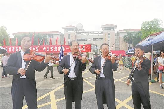 来接考生的家长中,最“拉风”的莫过于带着乐团好友、西装笔挺的宋爸爸。他带着乐队的好友,正装出席,精心设计了一个小型音乐会,计划给孩子一个惊喜:先由孩子的妈妈在前送花“引”出孩子,随后孩子爸爸和朋友们在后演奏音乐,“我们用音乐不仅接自己的孩子,也要接今天所有的考生”。宋同学出考场后也感到十分惊喜,和另一个会拉琴的同学在现场“斗”起了琴,一扫大考的压力。