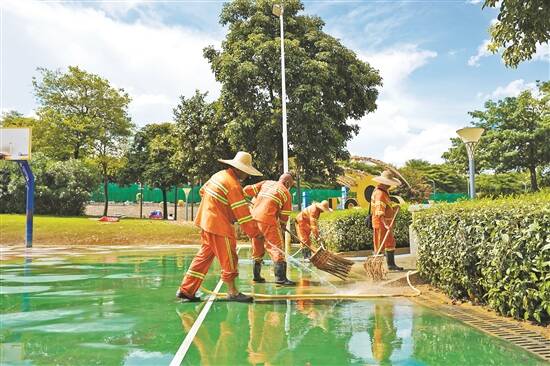 据介绍,在清理过程中,禅城园林部门采用“机械+人工”的模式,使用高压水车对公园的路面、防护栏及花基进行清洗,园林工人再使用铁铲、扫帚对路面进行深度清理,确保淤泥清理干净。