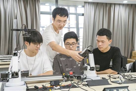深信院注重产教融合,图为该校陈骁老师指导学生进行机械臂码垛实验