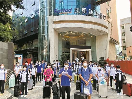 6月28日上午8:00,深圳市宝安区西乡街道凯里亚德隔离酒店门口正上演暖心一幕:宝安某中学49名学生集体向防疫工作人员表达谢意,并将亲手制作的小礼品转交专班工作人员代表。