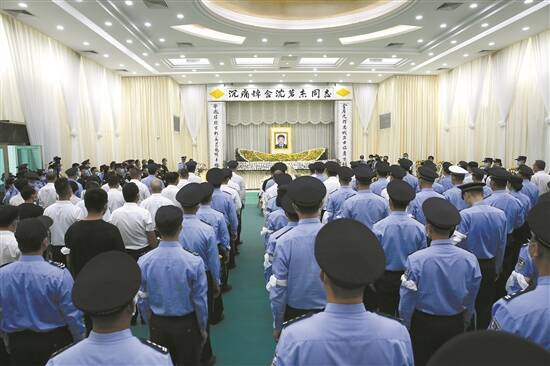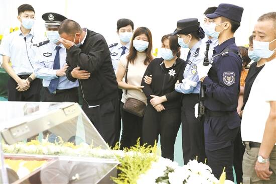 7月5日,江门市殡仪馆牡丹厅内气氛肃穆,众人强忍悲伤,送别日前因公殉职的江门市公安局蓬江分局见习民警沈茗杰。