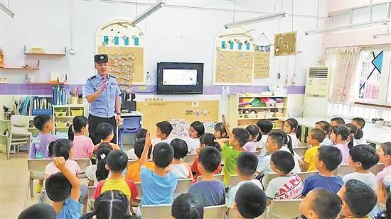 暑假是学生安全事故的多发时期。今年放暑假之前,东莞一些学校就提前开展安全教育进校园活动。7月以来,东城各幼儿园、小学迎来一批特殊老师——东城公安局各警务室的民警,他们为学生送去了暑假安全法治教育课。民警用小孩听得懂的语言,并结合宣传PPT、动画宣传片、现场模拟等生动有趣的形式,向学生们讲解用电用火、交通安全、防溺水、防拐防骗、自救逃生、面对意外暴力伤害时的应对措施等安全知识。