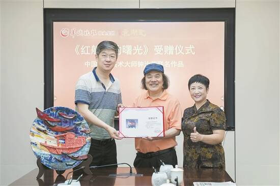 7月29日,中国工艺美术大师钟汝荣携陶艺新作《红船上的曙光》来到羊城晚报报业集团,并与广东省袁湖记文化发展有限公司董事长袁惠冰、总经理张英奇一道,共同向羊城晚报赠予该新作的第01号作品。羊城晚报报业集团党委委员、副社长、副总编辑胡泉出席受赠仪式。