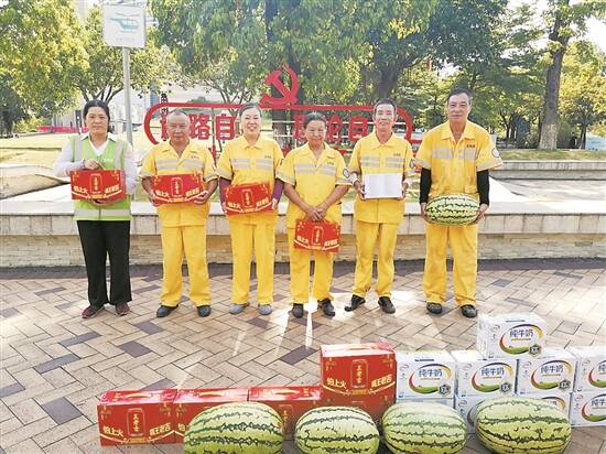 “这么热的天,您辛苦了!”现场党员志愿者们将10箱凉茶、10箱牛奶及5个西瓜等解暑物品的“清凉爱心包”送到环卫工人手中。同时,叮嘱环卫工人们在高温天气下一定要做好自我防护,防止高温中暑,保障自身健康。