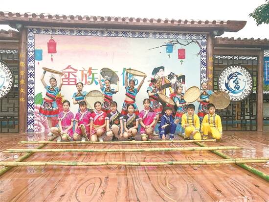 如今,走在校园里,随处可见畲族文化元素,充满着浓厚的畲族文化气息。学校墙壁绘着畲族生活场景,畲族文化墙展示出畲族特色文化。在广场中间设置了畲族文化舞台,每逢畲族节日,总能看到一群穿着鲜艳民族特色服装的畲族女孩,唱着《情定三月三》,跳起欢快的竹竿舞,人们跟随节拍翩翩起舞……在这里,仍能看到畲族多彩文化的印记。