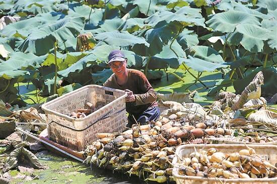 近日,记者来到位于大鱼沙村十字洲的莲藕种植基地,在连片的藕塘里,荷叶在藕田里摇曳,荷花点缀其中,在阳光下组成一幅生动活泼的画卷。几名工人正在采挖莲藕,随着淤泥被高压水枪冲掉,他们迅速地拨开荷叶杆,伸手到泥里,顺着藕节摸索,顺势拔出莲藕。不一会儿,一条条雪白的莲藕接二连三地浮出水面。
