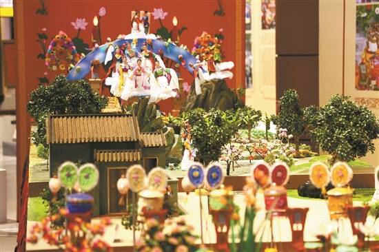 当晚活动现场,最引人关注的是一件凝聚着东莞人智慧和国家级荣誉的非遗作品——七夕贡案。代表着望牛墩七夕风情文化节精髓的七夕贡案《仙凡缘》曾获得中国民间文化最高奖——第十届中国民间文艺山花奖“民间工艺美术作品奖”。