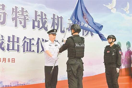 羊城晚报讯 记者彭纪宁、实习生钟银佩,通讯员谭耀广、林春晓摄影报道:8月8日,江门市公安局举行特战机动队授旗暨首战出征仪式,江门市副市长、公安局党委书记、局长冯小钢出席并作讲话,相关部门主要领导及特战机动队全体队员300人参加了仪式。